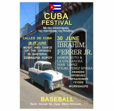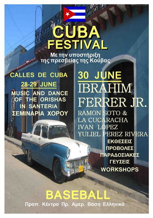 Γιατί τo πιο latin πάρτι του καλοκαιριού λέγεται 1ο Cuba Festival!! Και θα ξεκινήσει σε δύο κεντρικά σημεία της Αθήνας την Πέμπτη 28 και την Παρασκευή 29 Ιουνίου για να κορυφωθεί στο Προπονητικό Κέντρο Baseball (Πρώην Αμερικάνικη Βάση- Δεξαμενή Λεωφόρος Βουλιαγμένης, Ελληνικό) το Σάββατο 30 Ιουνίου με μια μεγάλη συναυλία του Ibrahim Ferrer Jr στο πλαίσιο του βασικού αφιερώματος του Φεστιβάλ στον θρύλο της Κουβανέζικης μουσικής Ibrahim Ferrer, ενώ στη συγκεκριμένη βραδιά θα υπάρχουν πολλές μουσικοχορευτικές, εικαστικές αλλά και «πιστές στο ύφος της βραδιάς» εκπλήξεις!!