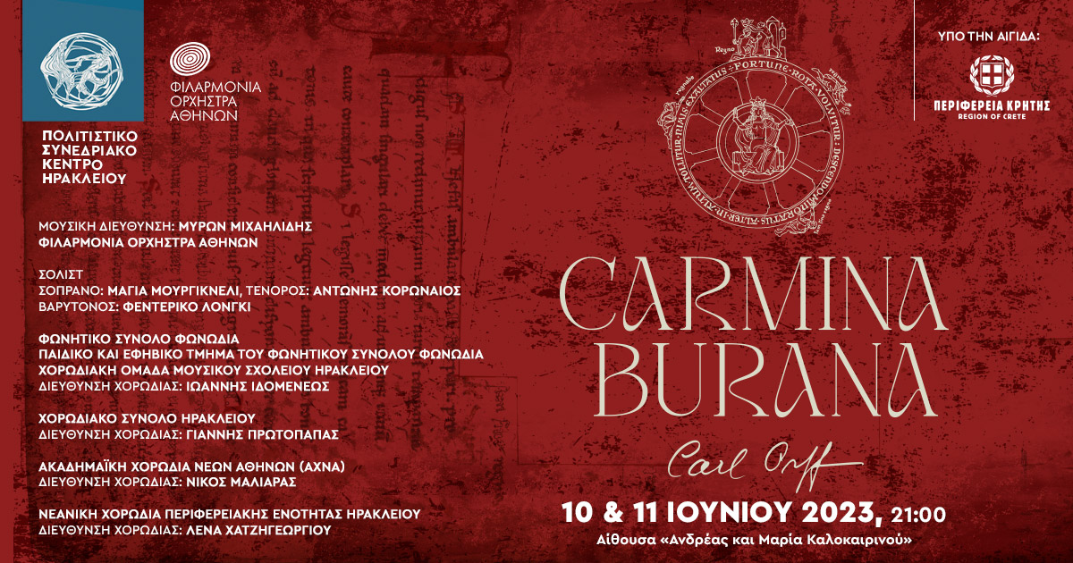 Ένα από τα πιο δημοφιλή έργα του σύγχρονου ρεπερτορίου του 20ού αιώνα, η Καντάτα Carmina Burana του Γερμανού συνθέτη και μουσικοπαιδαγωγού Καρλ Ορφ, θα παρουσιαστεί σε δύο μόνο συναυλίες στη σκηνή του Πολιτιστικού Συνεδριακού Κέντρου Ηρακλείου, με τη σύμπραξη της Φιλαρμόνια Ορχήστρας Αθηνών, σε μουσική διεύθυνση του αρχιμουσικού Μύρωνα Μιχαηλίδη, και χορωδιακών συνόλων.