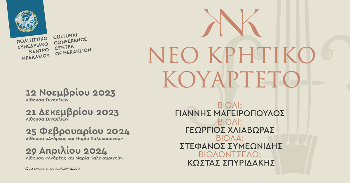 Το Νέο Κρητικό Κουαρτέτο γεννήθηκε το 2018 μέσα από τα σπλάχνα της Συμφωνικής Ορχήστρας Νέων Δήμου Ηρακλείου υπό την επίβλεψη και καθοδήγηση του βιολιστή Γιώργου Δεμερτζή. Το όνομά του αποτελεί αναφορά στο Κρητικό Κουαρτέτο του Αριστείδη Αντωνακάκη, το οποίο δραστηριοποιήθηκε στο Ηράκλειο Κρήτης κατά τις αρχές προς τα μέσα του 20ου αιώνα.