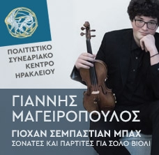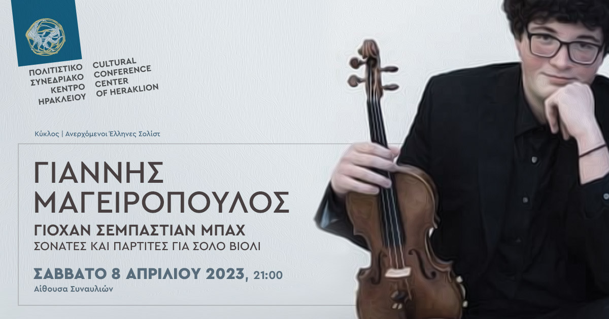 Ο εξαίρετος ηρακλειώτης βιολονίστας Γιάννης Μαγειρόπουλος, μετά την επιτυχία του στα 24 Καπρίτσια για Βιολί του Νικολό Παγκανίνι τον Μάιο του 2022, που ενθουσίασε το κοινό με την ερμηνεία του στα συγκεκριμένα έργα εκρηκτικής δεξιοτεχνικής δυσκολίας, επιστρέφει στο Πολιτιστικό Συνεδριακό Κέντρο Ηρακλείου με ένα Ρεσιτάλ βιολιού με τις Σονάτες και τις Παρτίτες του Γιόχαν Σεμπάστιαν Μπαχ. Η συναυλία του πολλά υποσχόμενου ανερχόμενου νέου σολίστα είναι μια ευκαιρία για το κοινό του Ηρακλείου να παρακολουθήσει ένα πηγαίο ταλέντο και την εντυπωσιακή τεχνική του στο βιολί στα απαιτητικά επίσης έργα του Μπαχ, που αναδεικνύουν την πολυφωνική δυναμική αλλά και την αυτάρκεια του συγκεκριμένου σολιστικού οργάνου.