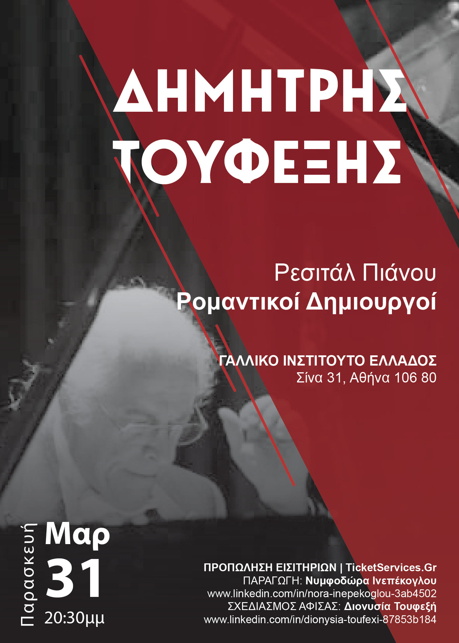 Ένα μουσικό οδοιπορικό μέσα από αριστουργήματα ρομαντικών δημιουργών του πιανιστικού ρεπερτορίου με την καθηλωτική ερμηνεία του διακεκριμένου σολίστ Δημήτρη Τουφεξή. Ερμηνεία που συνεπαίρνει συναισθηματικά, μεταμορφώνει ψυχικά και χαρακτηρίζεται από βαθιά εσωτερικότητα, αισθαντικότητα και ανεπιτήδευτη δεξιοτεχνική διαύγεια. Τη μουσική βραδιά πλαισιώνουν αφηγηματικά σχόλια που αφορούν στη ζωή και στο έργο των μεγάλων συνθετών.