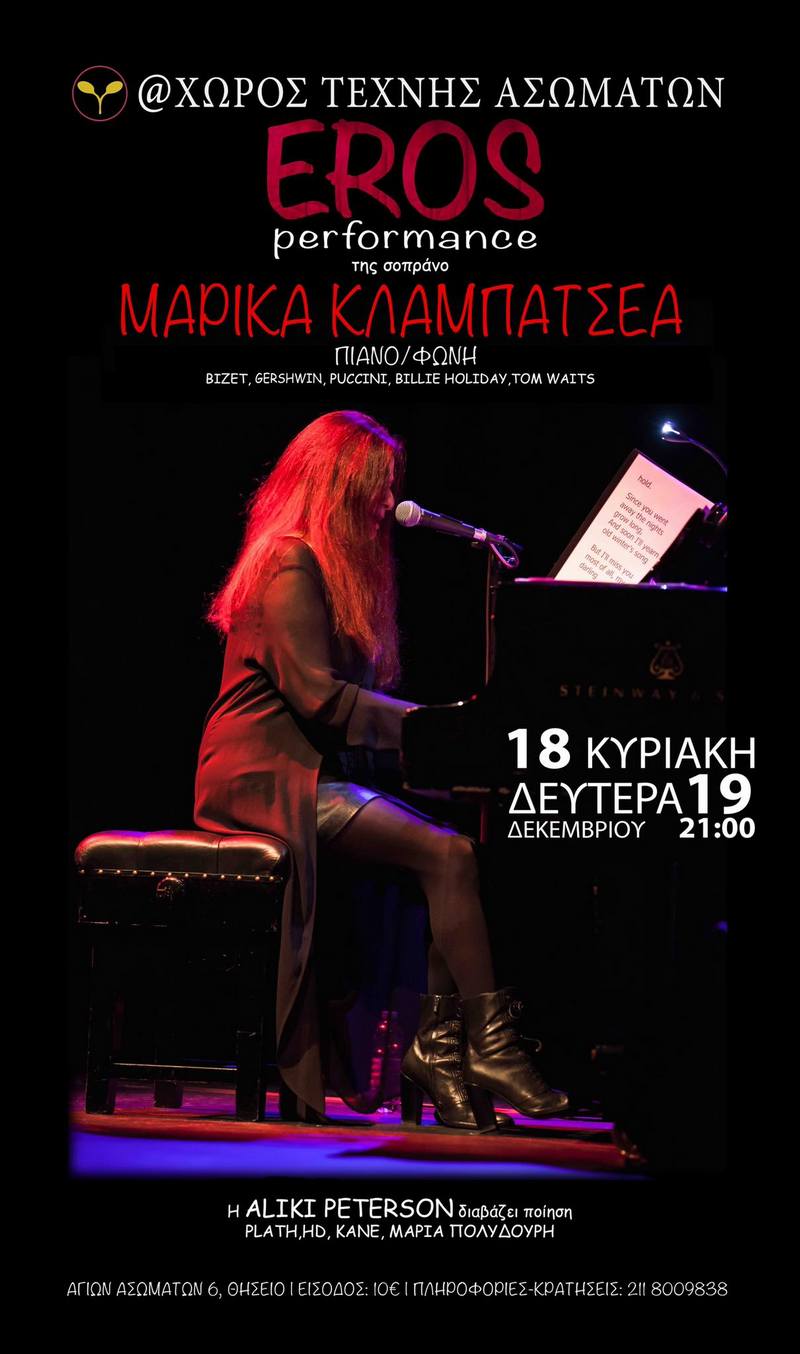 Μετά από τη θερμή αποδοχή του κοινού και με αφορμή την Παγκόσμια Ημέρα Ποίησης (21/3), η βραβευμένη σοπράνο, συνθέτρια και πιανίστα Μαρίκα Κλαμπατσέα επαναλαμβάνει τη performance "EROS" για δύο Παρασκευές του Μαρτίου, 21 και 28, στον φιλόξενο Χώρο Τέχνης Ασωμάτων.