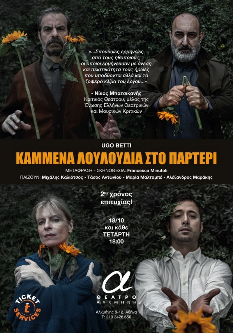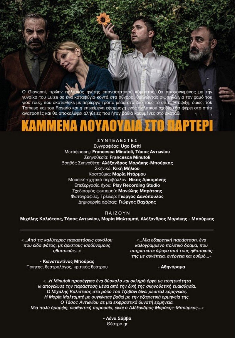 «Καμένα λουλούδια στο παρτέρι» είναι ο τίτλος σε ελεύθερη απόδοση του έργου του Ugo Betti «L' aiuola bruciata». Το έργο είναι γραμμένο μεταξύ του 1950 και 1952, σε μια περίοδο όπου η φασιστική λαίλαπα στην Ευρώπη άρχισε να υποχωρεί, αφήνοντας πίσω τις στάχτες και τον συντηρητισμό του πολέμου, επιδιώκει να μας συστήσει ένα εκ βαθέων πολιτικό δράμα με συνωμοσίες, ψέματα, χειριστικές διαθέσεις, σκληρές αποκαλύψεις και κρίσιμες αποφάσεις ζωής και θανάτου.