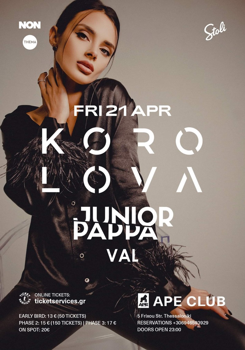 To APE υποδέχεται την Korolova, μια από τις πλέον περιζήτητες παρουσίες στον χώρο της μελωδικής house και techno. Σε μόλις ένα χρόνο, η Ουκρανή dj και παραγωγός έχει πραγματοποιήσει περισσότερες από 60 εμφανίσεις σε 20 χώρες, έχει συγκεντρώσει δεκάδες εκατομμύρια streams σε όλες τις πλατφόρμες, ενώ οι παραγωγές της έχουν κυκλοφορήσει σε φησμισμένα labels όπως AFTR:HRS, Get Physical Music, και Armada.