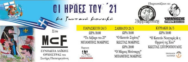 Δύο από τους κορυφαίους Έλληνες Καραγκιοζοπαίχτες Κώστας Σπυρόπουλος και Κώστας Μακρής, συμπράττουν με το Ίδρυμα Μιχάλης Κακογιάννης και παρουσιάζουν για πρώτη φορά κύκλο θεματικών παραστάσεων αφιερωμένων στους Ήρωες του 1821.