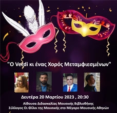 Τη Δευτέρα 20 Μαρτίου 2023 στις 8.30 το βράδυ, τρεις νέοι ταλαντούχοι λυρικοί καλλιτέχνες, η σοπράνο Ρέα Βουδούρη, ο τενόρος Νικήτας Γκρίτζαλης & ο βαρύτονος Πέτρος Σαλάτας, θα φορέσουν τις μάσκες τους και θα σας πάρουν μαζί τους σ' ένα μαγικό ταξίδι στα παλάτια του πρίγκιπα Ρικκάρντο και του Οθέλλου, στα σαλόνια της Βιολέττας Βαλερύ, του Αλφρέντο και του Ζερμόν, και στην αυλή της Ισπανίας του Ντον Κάρλο και των τροβαδούρων, με πλοηγό την υπέροχη μουσική του Τζ. Βέρντι και με τον Δημήτρη Χρυσανθακόπουλο στο πιάνο.