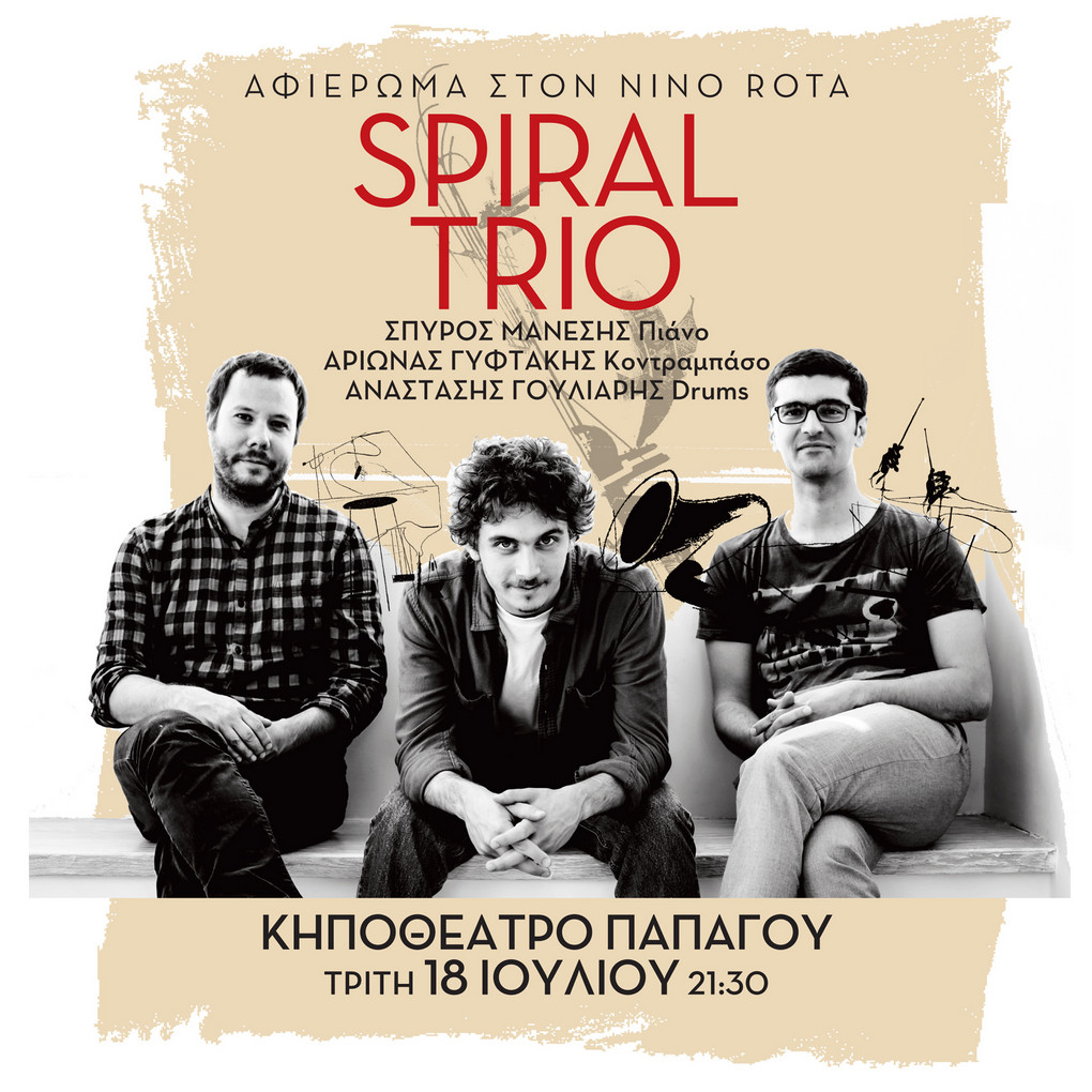 Την Τρίτη 18 Ιουλίου απολαύστε το Spiral Trio στο Κηποθέατρο Παπάγου, σε ένα μοναδικό αφιέρωμα όπου οι συνθέσεις του κορυφαίου Nino Rota μετατρέπονται σε ένα αναπάντεχο πεδίο jazz αυτοσχεδιασμών.