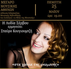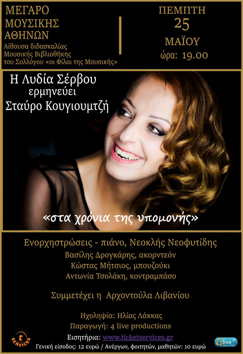 Στα «χρόνια της υπομονής», με ένα «κόκκινο φουστάνι» και «το πουκάμισο το θαλασσί» η Λυδία Σέρβου έρχεται «διψασμένη για αγάπη» να μας ταξιδέψει με τα τραγούδια του Σταύρου Κουγιουμτζή, ενός ευαίσθητου και αγαπημένου δημιουργού που έβαλε την υπογραφή του σε πολύ μεγάλες επιτυχίες και η Λυδία με την ιδιαίτερη χροιά της θα μας τις ερμηνεύσει την Πέμπτη 25 Μαΐου στις 19.00 στην Αίθουσα Διδασκαλίας Μουσικής Βιβλιοθήκης του Συλλόγου «Οι Φίλοι της Μουσικής» στο Μέγαρο Μουσικής Αθηνών.