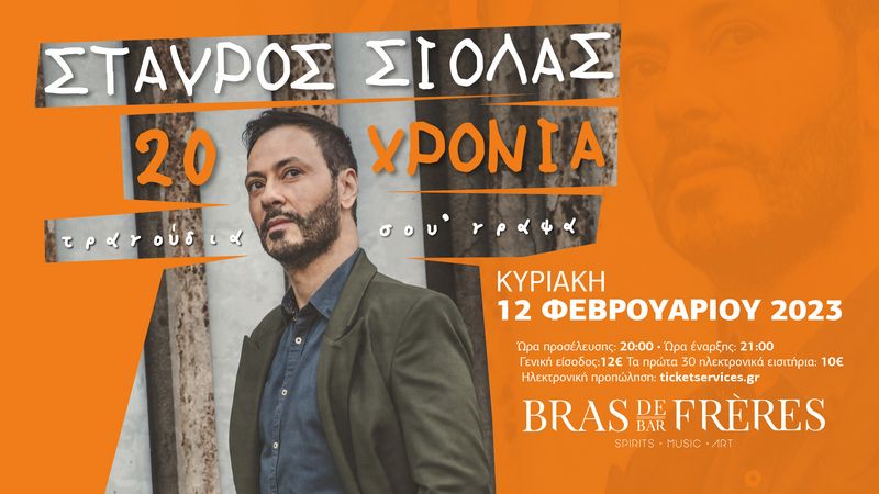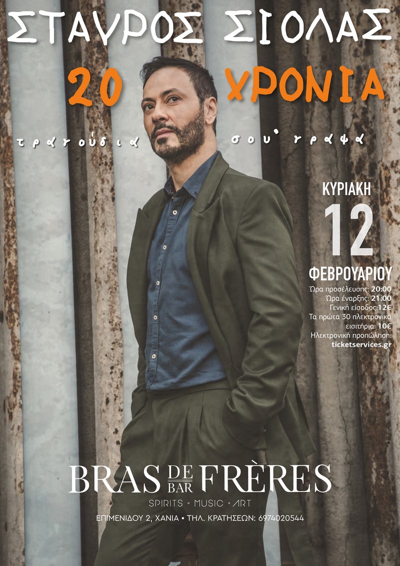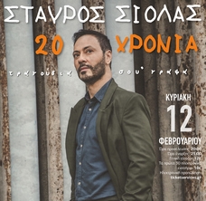 Ο Σταύρος Σιόλας, μετά τις sold out εμφανίσεις του στην Αθήνα έρχεται στα Χανιά την Κυριακή 12 Φεβρουαρίου για να γιορτάσει μαζί μας τα 20 χρόνια από την κυκλοφορία του πρώτου δίσκου του με μια παράσταση που θα ακολουθεί την πορεία της δισκογραφίας του αλλά και τραγούδια που τον ενέπνευσαν.