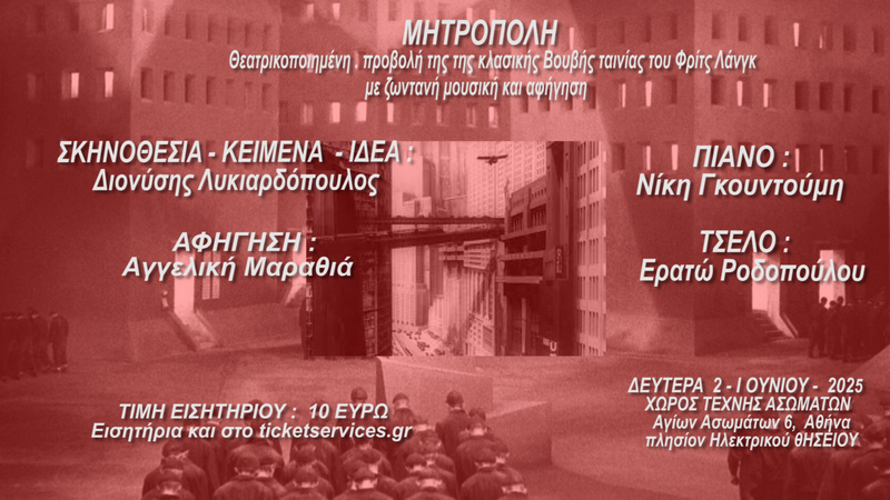 μια θεατρικοποιημένη προβολή, με τη συνοδεία ζωντανής μουσικής και αφήγηση, της κλασικής α/μ βουβής ταινίας του Φρίτς Λάνγκ METROPOLIS (του 1927),  που ακόμα και 100 χρόνια μετά,  παραμένει ένα φουτουριστικό διαχρονικό αριστούργημα.
