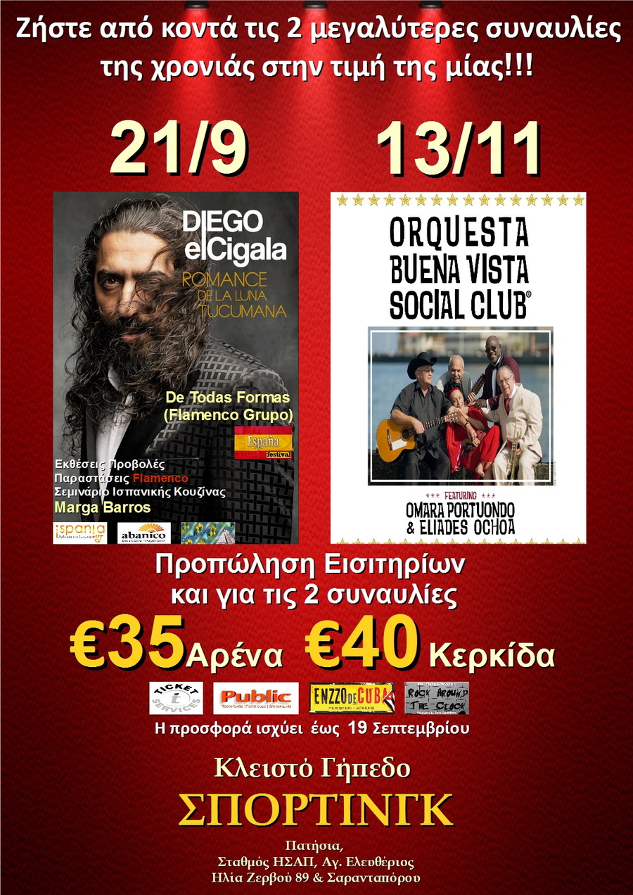 Συγκεκριμένα στο πλαίσιο του Espana Festival και της συναυλίας του μεγαλύτερου παγκοσμίως τραγουδιστή του Flamenco Diego El Cigala από την Ισπανία, που θα διεξαχθεί στην Αθήνα στις 21 Σεπτεμβρίου 2013 και της συναυλίας των Θρύλων της Κουβανέζικης & Latin μουσικής σκηνής Orquesta Buena Vista Social Club Featuring Omara Portuondo & Eliades Ochoa που θα διεξαχθεί στην Αθήνα την Τετάρτη 13 Νοεμβρίου 2013 -στα πλαίσιο των ετήσιων εκδηλώσεων του Cuba Festival- προσφέρεται στην προπώληση η μοναδική τιμή εισιτηρίου των 35€ στην Αρένα και 40€ στην Κερκίδα και για τις δύο συναυλίες!!