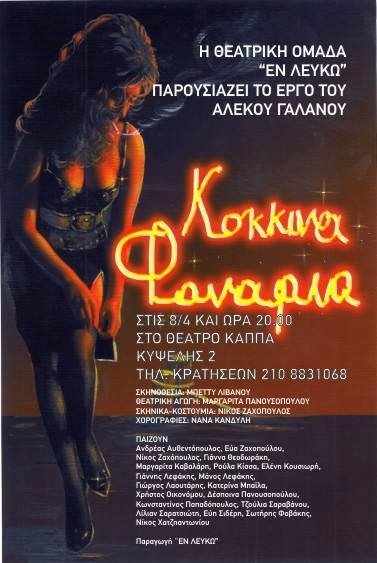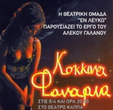 Μετά την πολύ επιτυχημένη παράσταση «Η αυλή των θαυμάτων» του Ιάκωβου Καμπανέλλη, η θεατρική ομάδα «Εν Λευκώ» παρουσιάζει φέτος τα «Κόκκινα Φανάρια» του Αλέκου Γαλανού, σε σκηνοθεσία και πάλι της Μπέττυς Λιβανού, που ίδρυσε την ομάδα.