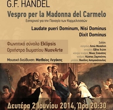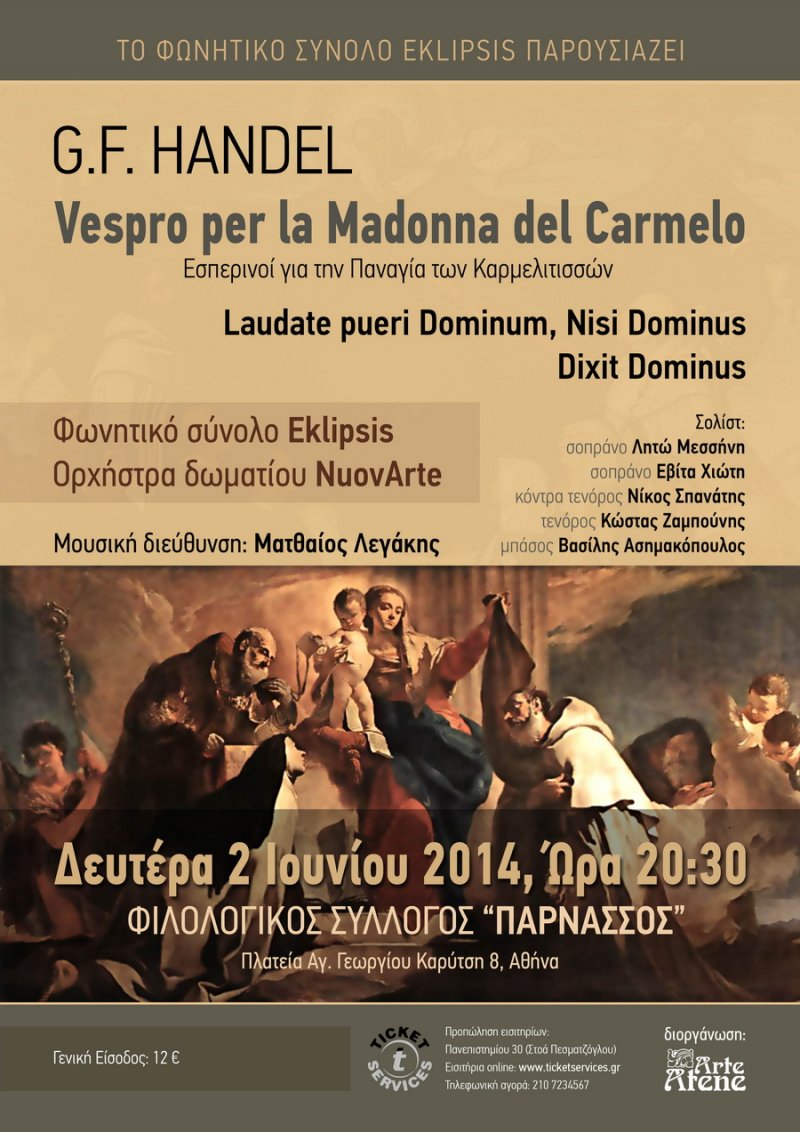 Την Δευτέρα 2 Ιουνίου 2014 και ώρα 20:30, η ιστορική αίθουσα του Φιλολογικού Συλλόγου «Παρνασσός» θα φιλοξενήσει ένα μεγάλο καλλιτεχνικό γεγονός, την μπαρόκ συναυλία "Vespro per la Madonna del Carmelo" (Εσπερινοί για την Παναγία των Καρμελιτισσών), του Georg Friedrich Händel (Γκέοργκ Φρήντριχ Χαίντελ) με πέντε σολίστ, πεντάφωνη χορωδία και ορχήστρα εγχόρδων.