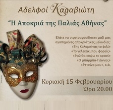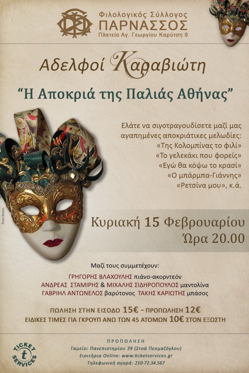 Την Κυριακή 15 Φεβρουαρίου 2015 και ώρα 20:00 στην κεντρική αίθουσα του Φιλολογικού Συλλόγου «Παρνασσός» (Πλ.Αγίου Γεωργίου Καρύτση 8), οι Αδελφοί Καραβιώτη θα παρουσιάσουν την συναυλία:
