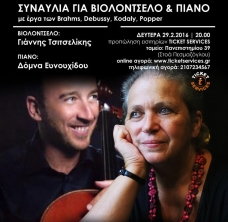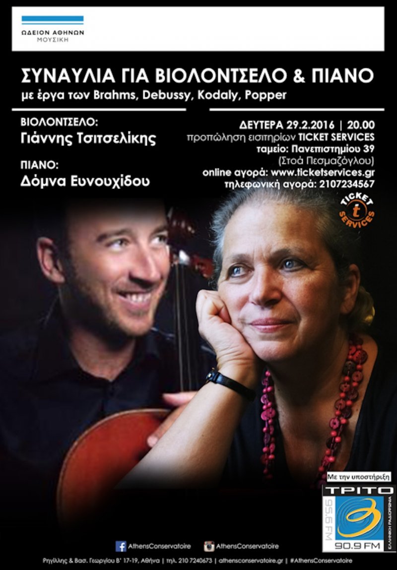 Στην αίθουσα «’ρης Γαρουφαλής» του Ωδείου Αθηνών, του αρχαιότερου μουσικού εκπαιδευτικού ιδρύματος της χώρας, θα πραγματοποιηθεί τη Δευτέρα 29 Φεβρουαρίου 2016 και ώρα 20:00, ένα μοναδικό ρεσιτάλ. Η πιο "θερμή" συνάντηση του 19ου αιώνα με τον 20ο αιώνα σε κορυφαία έργα της φιλολογίας του βιολοντσέλου απο τον γνωστό βιολοντσελίστα Γιάννη Τσιτσελίκη και τη καταξιωμένη πιανίστα Δόμνα Ευνουχίδου. Οι δύο καλλιτέχνες θα ταξιδέψουν απο τον Ρομαντισμό του Μπράμς στον Ιμπρεσιονισμό του Ντεμπυσσύ και απο τους Κόνταλυ και Πόπερ.