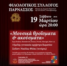 Η εκδήλωση θα λάβει χώρα το Σάββατο 19 Μαρτίου 2016, ώρα 20.00 στην Κεντρική αίθουσα του Φιλολογικού Συλλόγου «Παρνασσός» (πλατεία Αγίου Γεωργίου Καρύτση 8).