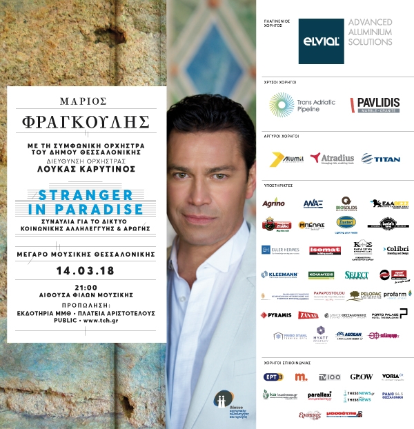 Το Δίκτυο Κοινωνικής Αλληλεγγύης και Αρωγής διοργανώνει Φιλανθρωπική Συναυλία με τον Έλληνα Τενόρο κ. Μάριο Φραγκούλη και με την Συμφωνική Ορχήστρα του Δήμου Θεσσαλονίκης την Τετάρτη 14 Μαρτίου 2018 στο Μέγαρο Μουσικής Θεσσαλονίκης. Διεύθυνση ορχήστρας Λουκάς Καρυτινός.
