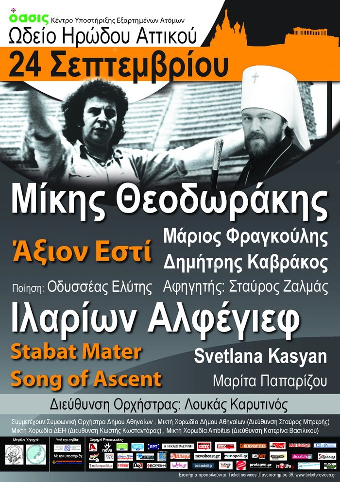 Το μνημειώδες έργο Άξιον Εστί του Μίκη Θεοδωράκη, βασισμένο σε ποίηση του βραβευμένου με Νομπέλ, Οδυσσέα Ελύτη, θα παρουσιαστεί κάτω από τον Παρθενώνα, συνοδευόμενο από τις συνθέσεις Stabat Mater και Song of Ascent-Ωδή των Αναβαθμών συμφωνία για χορωδία και ορχήστρα του Μητροπολίτη Ιλαρίωνα Αλφέγιεφ, ενός εκ των σημαντικότερων σύγχρονων Ρώσων συνθετών.