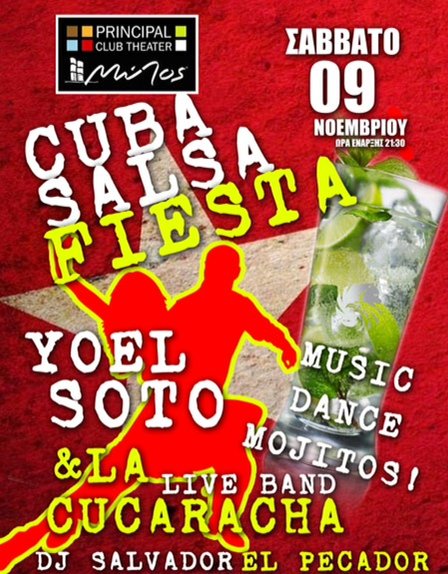 Το Σάββατο 9 Νοεμβριου στο Principal απολαμβάνουμε τη συναυλία από το μουσικό σχήμα Yoel Soto & La Cucaracha, που αποτελείται από τους πιο εξαίρετους κουβανούς μουσικούς της latin μουσικής σκηνής στην Ελλάδα.