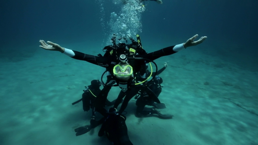 In an underwater “theatre”, fourteen performers (among them three disabled & three children) from France, Greece and Cyprus perform the underwater choreography in Cape Sounion beach, where the temple of Poseidon stands overlooking one of the most beautiful coasts of the Mediterranean -- the absolute inspirational background for the audience.