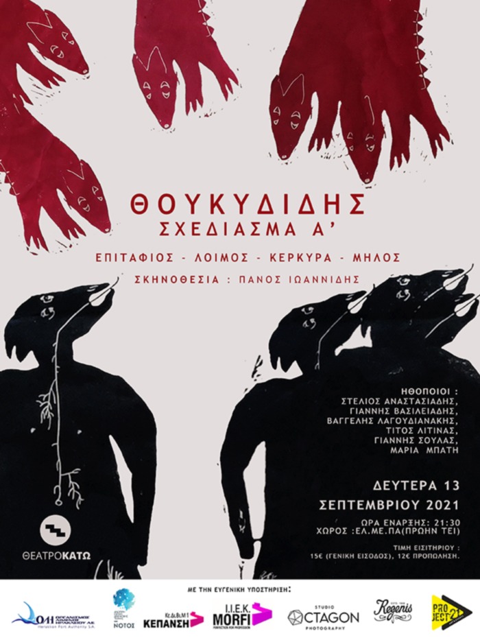 Το Θέατρο Κάτω παρουσιάζει τη Δευτέρα 13 Σεπτεμβρίου, στο ΕΛ.ΜΕ. ΠΑ στις 21:30, την παράσταση Θουκυδίδης: Σχεδίασμα Α΄ (Επιτάφιος – Λοιμός – Κέρκυρα – Μήλος), η οποία επιχειρεί να ανασυστήσει την εποχή του Πελοποννησιακού πολέμου μέσα από 4 σημεία της Ιστορίας του Θουκυδίδη και ένα απόσπασμα από τον Οιδίποδα Τύραννο του Σοφοκλή.