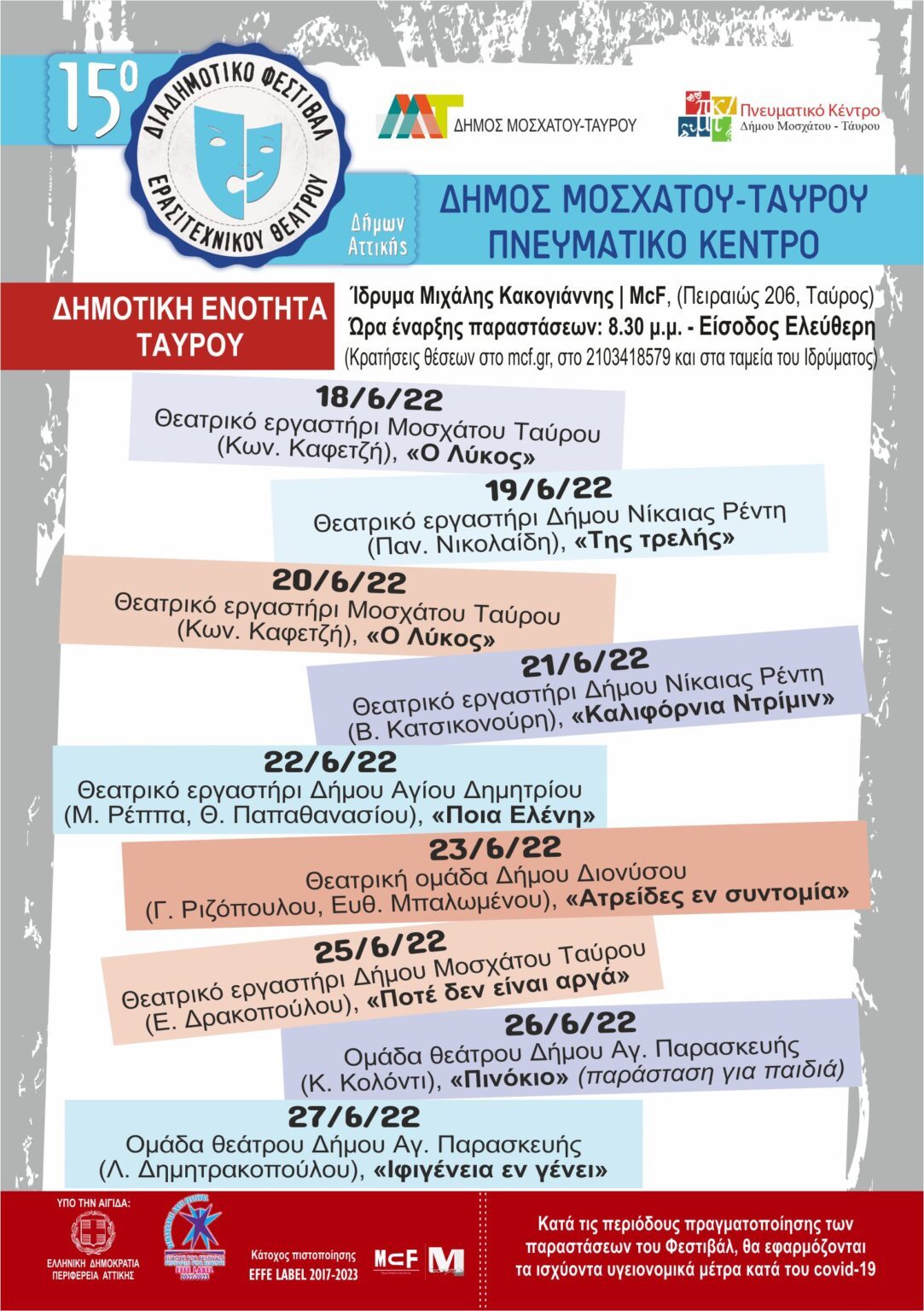 Πρόγραμμα παραστάσεων 15ου Διαδημοτικού Φεστιβάλ Ερασιτεχνικού Θεάτρου στο Δήμο Μοσχάτου Ταύρου.