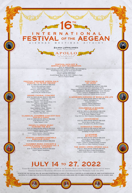 | FESTIVAL PREMIERE OPERA GALA "Tribute to Peter Tiboris" July 15, 2022 (20:30) Apollo Theater Greek & International soloists Pianist: Manolis Papasifakis Choruses: Paris Children's Choir, American visiting Choirs Choir from the island of Syros |