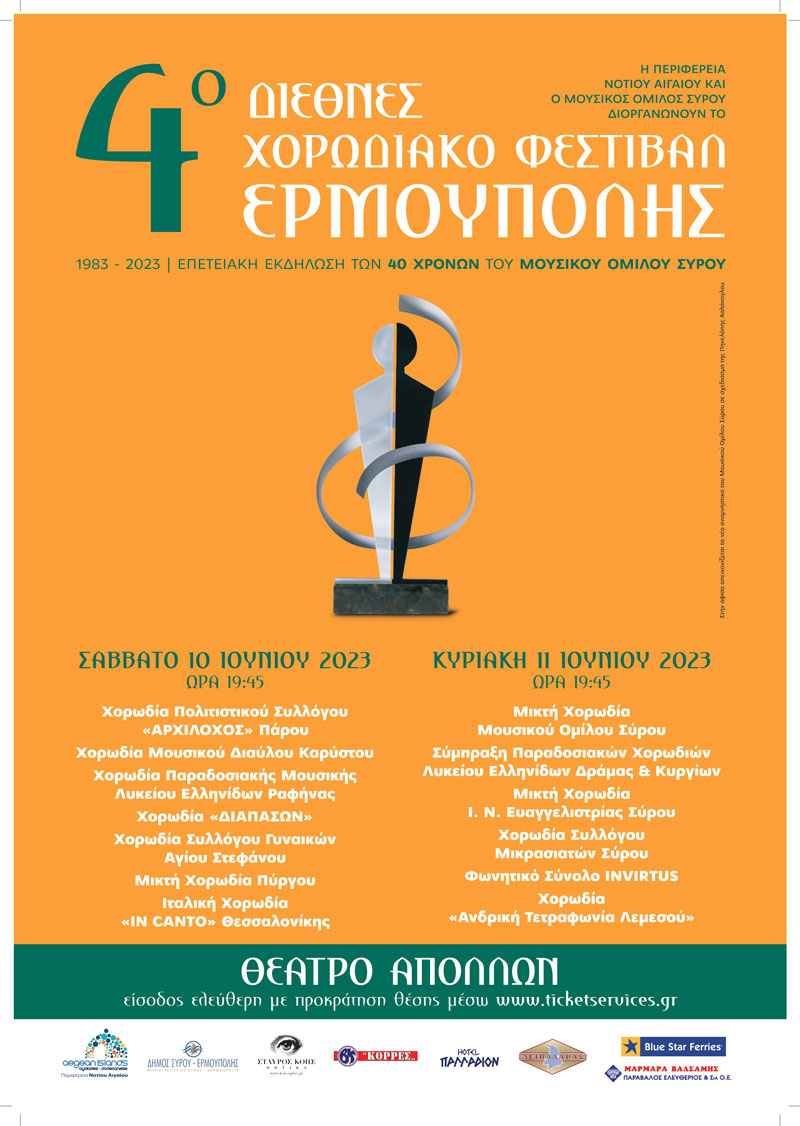 Ο Μουσικός Ομιλος Σύρου, σε συνδιοργάνωση με την Περιφέρεια Νοτίου Αιγαίου διοργανώνει το διήμερο 10 και 11 Ιουνίου 2023, το 4ο ΔΙΕΘΝΕΣ ΧΟΡΩΔΙΑΚΟ ΦΕΣΤΙΒΑΛ ΕΡΜΟΥΠΟΛΗΣ.