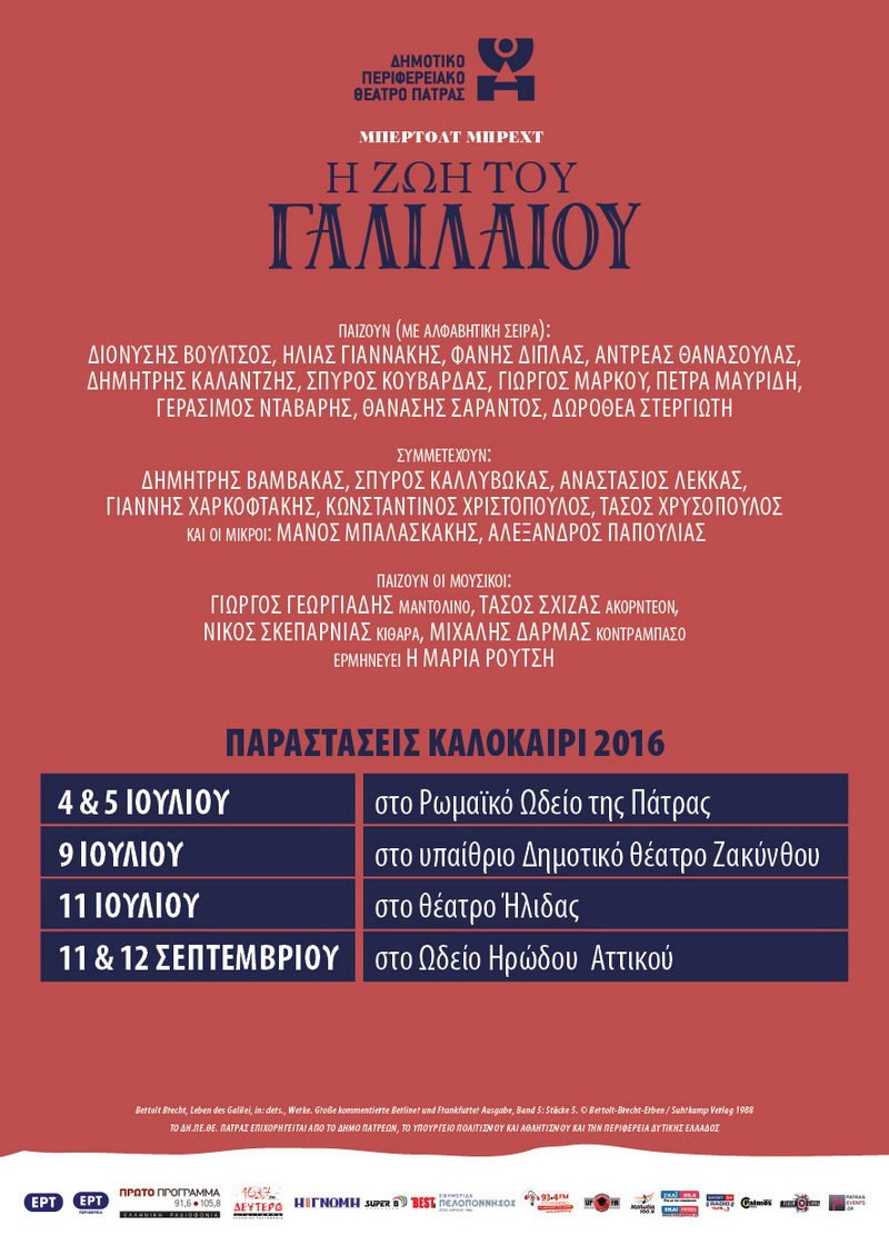 Το Διεθνές Φεστιβάλ Πάτρας στο πλαίσιο των εκδηλώσεων του θεσμού για το 2016, την Δευτέρα 4 και την Τρίτη 5 Ιουλίου, στις 9.30 το βράδυ, φιλοξενεί στο Αρχαίο Ωδείο, το αριστούργημα του Μπέρτολτ Μπρέχτ Η ζωή του Γαλιλαίου, σε σκηνοθεσία Κώστα Καζάκου.