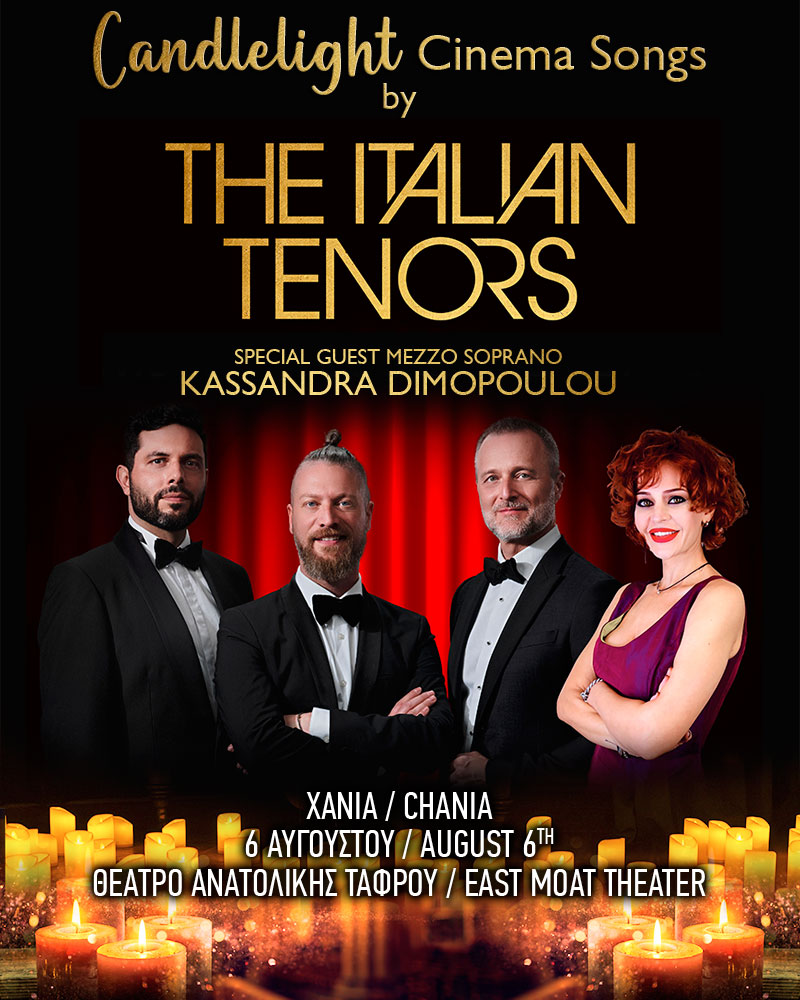 Οι αγαπημένοι του ελληνικού κοινού "The Italian Tenors", έρχονται στης 6 Αύγουστου στα Χανιά με ένα καινούργιο, πολύ ιδιαίτερο πρότζεκτ, «Candlelight Cinema Songs», αφιερωμένο στα πιο όμορφα τραγούδια του Ιταλικού αλλά και παγκοσμίου κινηματογράφου, με μια ιδιαίτερη ρομαντική ατμόσφαιρα Υπό το Φως των Κεριών