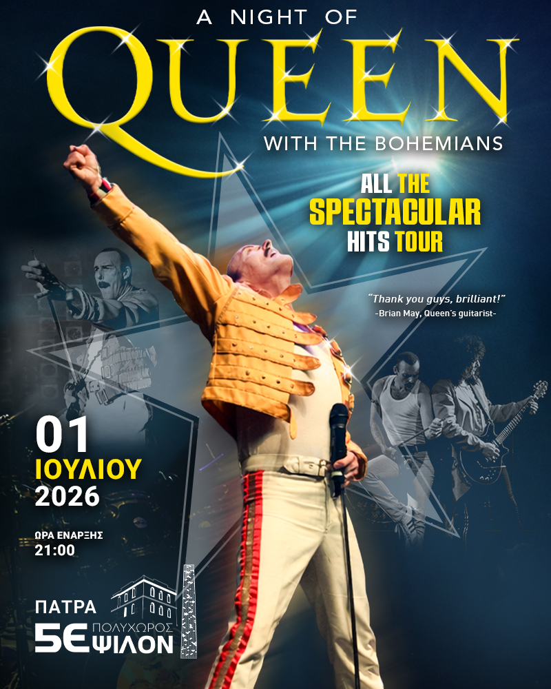 "Bohemian Rhapsody", "The Show Must Go On", "We Will Rock You", "I Want to Break Free", "A Kind of Magic", "We Are the Champions" και "Radio Ga Ga" είναι μόνο μερικές από τις μεγάλες επιτυχίες των θρυλικών Queen, που ζωντανεύουν επί σκηνής στις 1 Ιουλίου στον Πολυχώρο 5 Έψιλον στην Πάτρα.