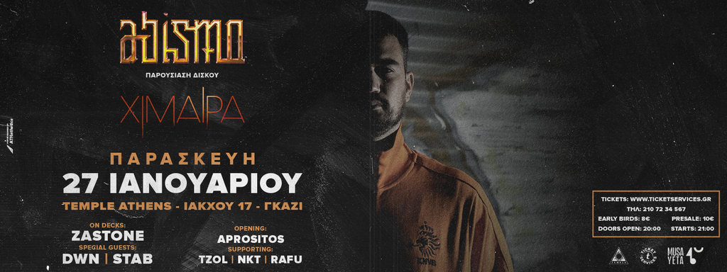 Μετά την απήχηση που είχε ο δίσκος στις ψηφιακές πλατφόρμες από την κυκλοφορία μου μέχρι σήμερα, ήρθε η ώρα για τον Abismo να σταθεί στην σκηνή του Temple και να αφηγηθεί live την ιστορία της δικής του «Χίμαιρας». Μαζί του στα decks ο Zastone, με special guests τους DWN και Stab. Επίσης, opening act από Aprositos και supporting acts από Tzol, NKT και Rafu.