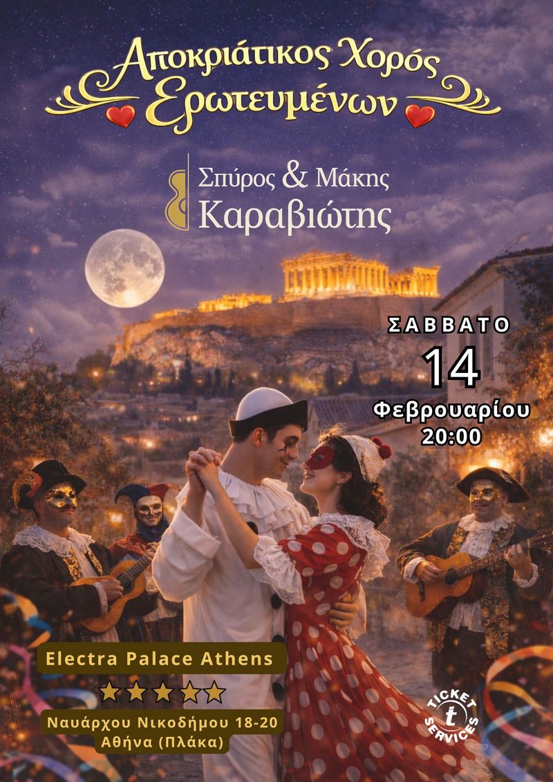 • Σάββατο 14 Φεβρουαρίου 2026, 20:00 Αποκριάτικος Χορός Ερωτευμένων ELECTRA PALACE ΕΙΣΙΤΗΡΙΑ