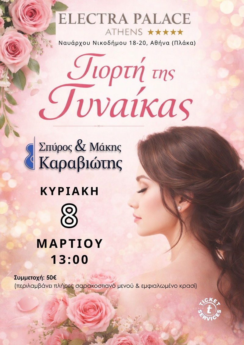 • Κυριακή 08 Μαρτίου 2026, 13:00 «Γιορτή της Γυναίκας» ELECTRA PALACE ΕΙΣΙΤΗΡΙΑ