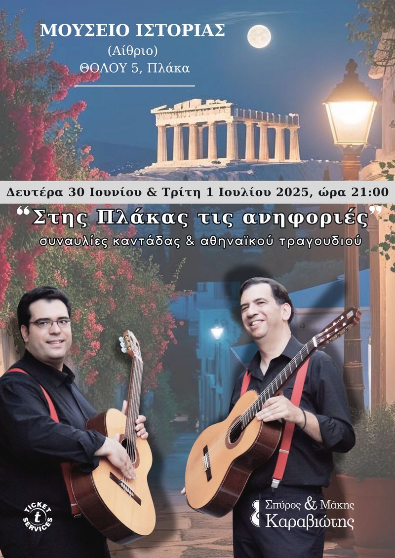 Την Δευτέρα 30 Ιουνίου & την Τρίτη 1η Ιουλίου 2025 και ώρα 21:00 στο Αίθριου του Μουσείου Ιστορίας του Πανεπιστημίου Αθηνών (Θόλου 5, Πλάκα), οι τροβαδούροι Σπύρος & Μάκης Καραβιώτης θα παρουσιάσουν δυο μοναδικές συναυλίες με τίτλο: