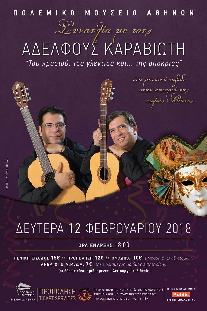 Ένα μουσικό ταξίδι στην αποκριά της παλιάς Αθήνας, με αγαπημένες καντάδες του κρασιού και του γλεντιού, από τη χορωδιακή συντροφιά των αδελφών Καραβιώτη συνοδεία μαντολίνων & κιθάρων. Νοσταλγικές μελωδίες, όπως: «Η ανθισμένη αμυγδαλιά», «Η Παλιά ταβέρνα», «Ο Μπάρμπα-Γιάννης καντάτας», «Το γελεκάκι που φορείς», «Ακόμα ένα ποτηράκι», «Της Κολομπίνας το φιλί», έρχονται να συνθέσουν μια ρομαντική ιστορία του χθες, μέσα από τρυφερές αφηγήσεις, που φτάνει ως το σήμερα.