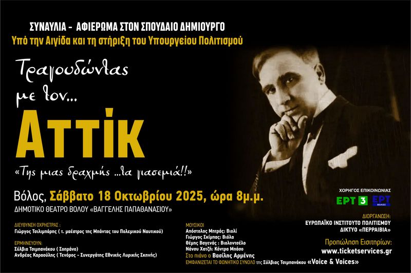 Μια μοναδική μουσική παράσταση-αφιέρωμα, τώρα και στο Βόλο, στον εμβληματικό μουσικό δημιουργό Αττίκ, 140 χρόνια μετά τη γέννησή του, που έβαλε τη σφραγίδα του στο Ελληνικό ρομαντικό τραγούδι, θα έχουν την ευκαιρία να ζήσουν, όσοι τυχεροί βρεθούν στο Δημοτικό Θέατρο Βόλου « Βαγγέλης Παπαθανασίου», το Σάββατο 18 Οκτωβρίου 2025 και ώρα 8 το βράδυ, σε μια παράσταση με δεκάδες συντελεστές, γεμάτη ποιότητα, αισθητική, χρώματα, έντονες συγκινήσεις και νοσταλγία.