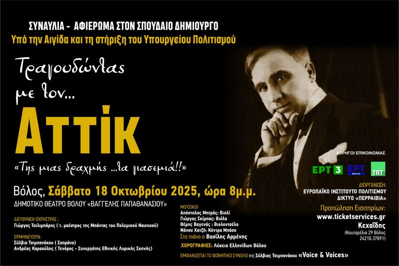 Μια μοναδική μουσική παράσταση-αφιέρωμα, τώρα και στο Βόλο, στον εμβληματικό μουσικό δημιουργό Αττίκ, 140 χρόνια μετά τη γέννησή του, που έβαλε τη σφραγίδα του στο Ελληνικό ρομαντικό τραγούδι, θα έχουν την ευκαιρία να ζήσουν, όσοι τυχεροί βρεθούν στο Δημοτικό Θέατρο Βόλου « Βαγγέλης Παπαθανασίου», το Σάββατο 18 Οκτωβρίου 2025 και ώρα 8 το βράδυ, σε μια παράσταση με δεκάδες συντελεστές, γεμάτη ποιότητα, αισθητική, χρώματα, έντονες συγκινήσεις και νοσταλγία.