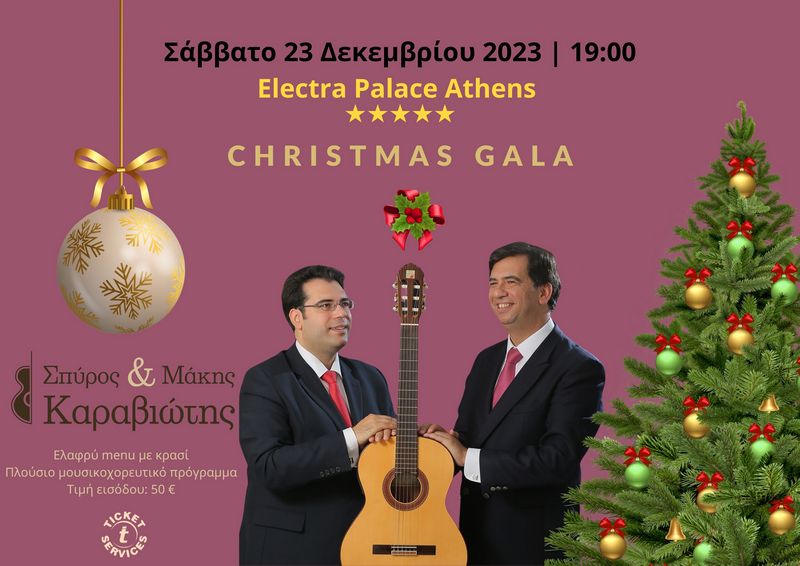 Οι αδελφοί Καραβιώτη σας προσκαλούν το Σάββατο 23 Δεκεμβρίου 2023 & ώρα 19:00 σε μια ξεχωριστή Χριστουγεννιάτικη εκδήλωση στο Ballroom του πολυτελούς ξενοδοχείου Electra Palace (Ναυάρχου Νικοδήμου 18 - 20, Πλάκα).