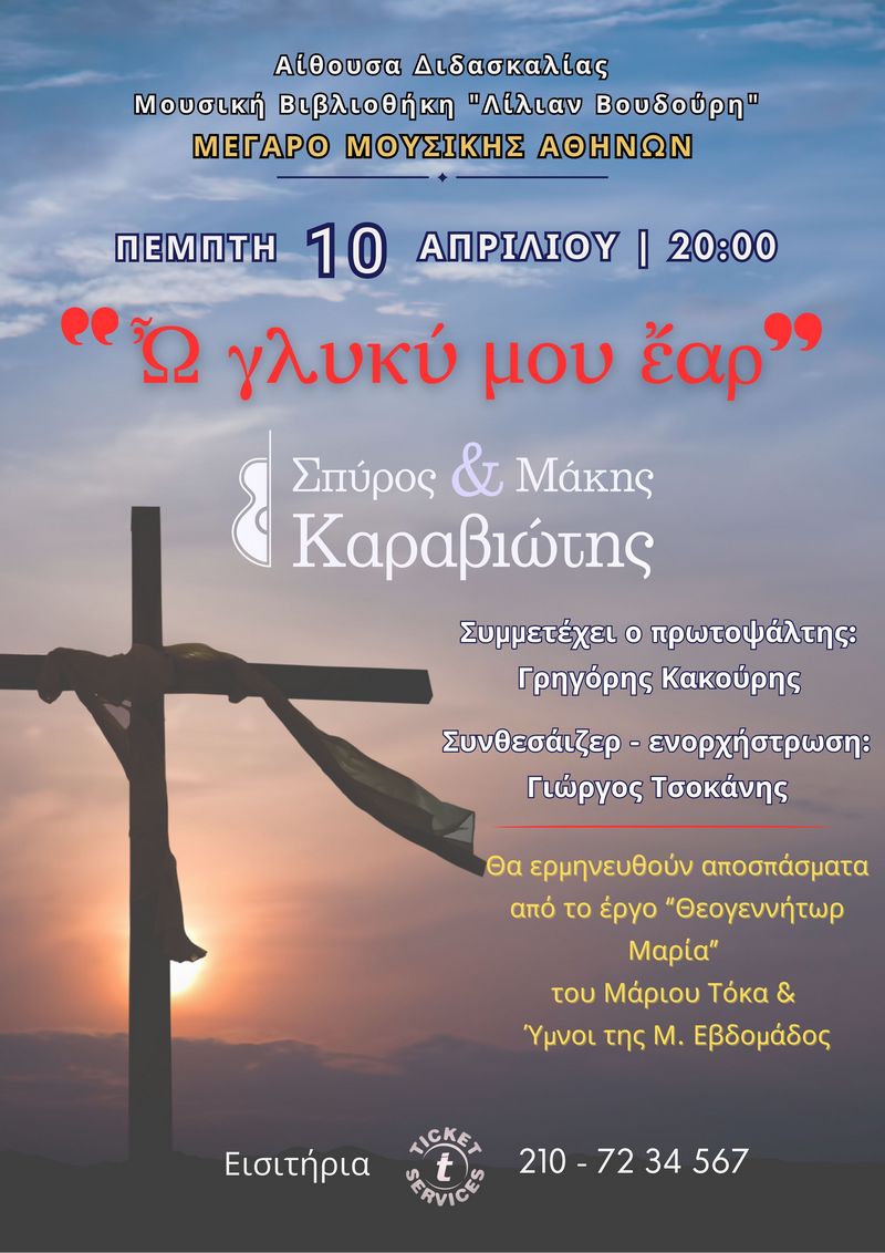 Οι τραγουδιστές της αγάπης Σπύρος & Μάκης Καραβιώτης και ο πρωτοψάλτης Γρηγόριος Κακούρης, την Πέμπτη 10 Απριλίου 2025 και ώρα 20:00 στην Αίθουσα Διδασκαλίας της Μουσικής Βιβλιοθήκης «Λίλιαν Βουδούρη» στο Μέγαρο Μουσικής Αθηνών (Βασιλίσσης Σοφίας & Κόκκαλη), παρουσιάζουν τη θρησκευτική συναυλία: