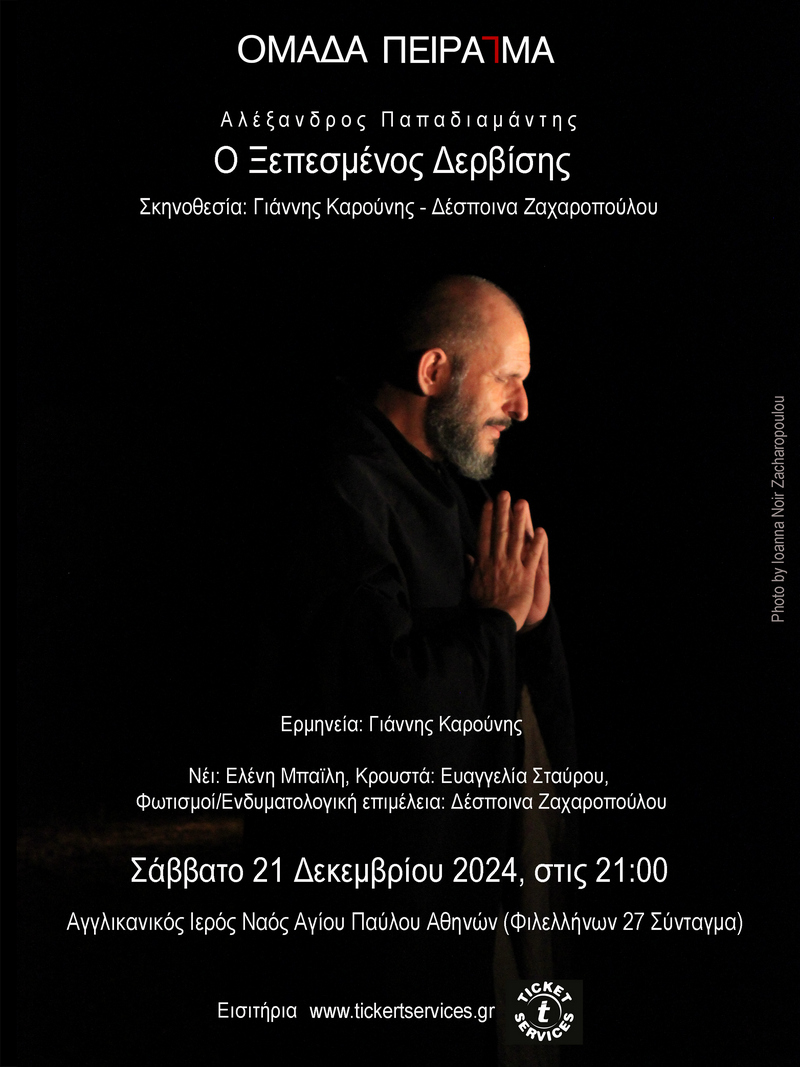 Ο τρόπος που προσεγγίσαμε τη θεατρική απόδοση του διηγήματος του Αλέξανδρου Παπαδιαμάντη, «Ο Ξεπεσμένος Δερβίσης,» βασίστηκε κυρίως στην τοποθέτηση σε πρώτο πλάνο της γλώσσας του συγγραφέα, σε μια προσπάθεια να την επαναφέρουμε στο σήμερα, σεβόμενοι τους ιδιωματισμούς, την ατμόσφαιρα και τον ρυθμό στον οποίο μας εισάγει. Για αυτό τον λόγο, αποφασίσαμε να απογυμνώσουμε τον σκηνικό χώρο στα ελάχιστα μέσα, χρησιμοποιώντας φυσικό ήχο στη φωνή και στα μουσικά όργανα. Στόχος μας είναι, ο θεατής να βγει από την ταχύτητα που χαρακτηρίζει την καθημερινότητά του και να εισέλθει σε έναν άλλο χρόνο, έναν άλλο ρυθμό, μια άλλη δόνηση.