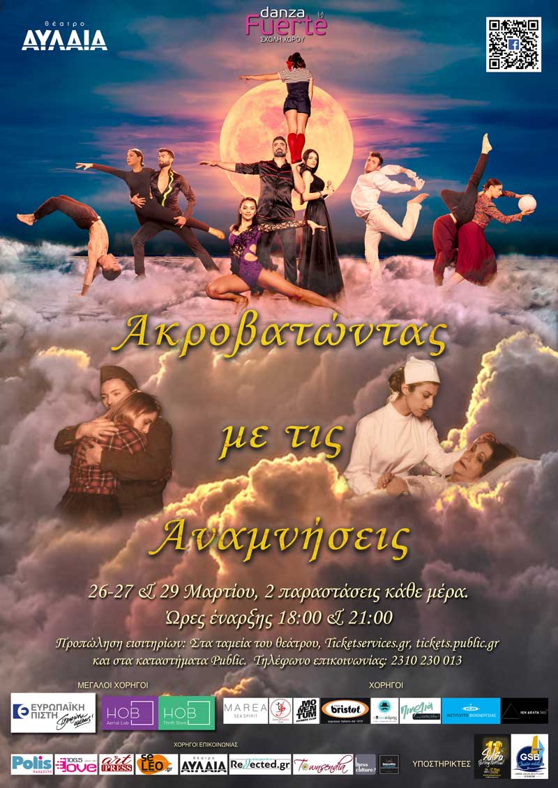 Ακροβατώντας με τις Αναμνήσεις είναι ένα Χοροθεατρικό υπερθέαμα που μέσα από τον χορό και την υποκριτική, περνάει μηνύματα για την οικογένεια και ιδιαίτερα για τη σχέση μητέρας-παιδιού, αλλά και για την τρίτη ηλικία και την Νόσο του Αλτσχάιμερ. Μια δραματική κωμωδία για μικρούς και μεγάλους, που συνδυάζει πολλά είδη χορού με ακροβατικά και συγκλονιστικές ερμηνείες δημιουργώντας μια φαντασμαγορική ατμόσφαιρα με ανατρεπτικό τέλος.