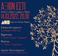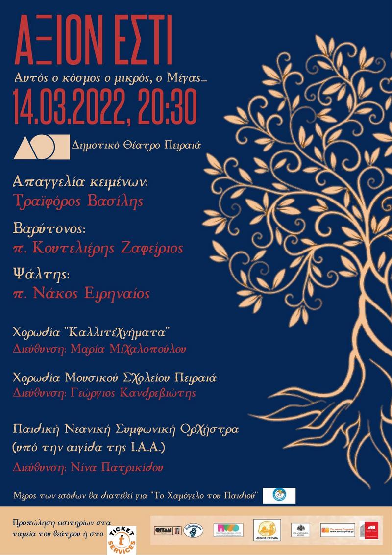 Την Δευτέρα 14 Μαρτίου 2022 και ώρα 20.30, στο Δημοτικό Θέατρο Πειραιά, θα παρουσιαστεί, υπό την αιγίδα της Ιεράς Αρχιεπισκοπής Αθηνών, το μνημειώδες έργο "Άξιον Εστί", σε μουσική Μίκη Θεοδωράκη και ποίηση Οδυσσέα Ελύτη, με σκοπό την ενίσχυση του οργανισμού «Το Χαμόγελο του Παιδιού».