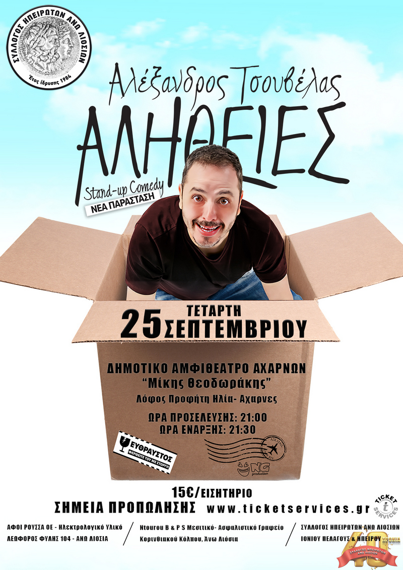 Φέτος λοιπόν, με αφορμή τα 40 χρόνια από την ίδρυση του Συλλόγου Ηπειρωτών Άνω Λιοσίων, ο πασίγνωστος καλλιτέχνης θα είναι εδώ μαζί μας και θα πει... αλήθειες!