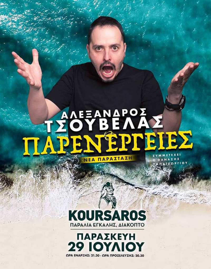 Ο Αλέξανδρος Τσουβέλας έρχεται στον Koursaro Beach Club με "Παρενέργειες"... σχέσεων, καθημερινότητας με εναλλαγή φωνών με πρόζα, κωμικά σκετς και αυτοσχεδιασμό.