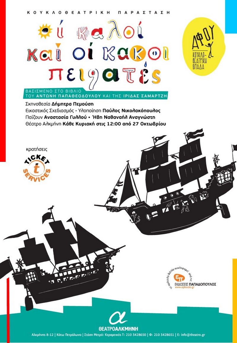 Μετά τα ασταμάτητα sold out στο θέατρο και στα σχολεία «Οι καλοί και οι κακοί πειρατές» επιστρέφουν! Μια αστεία, διαδραστική πειρατική περιπέτεια, βασισμένη στο πολυαγαπημένο βιβλίο του Αντώνη Παπαθεοδούλου και της Ίριδας Σαμαρτζή σε διασκευή της ομάδας Αφού!