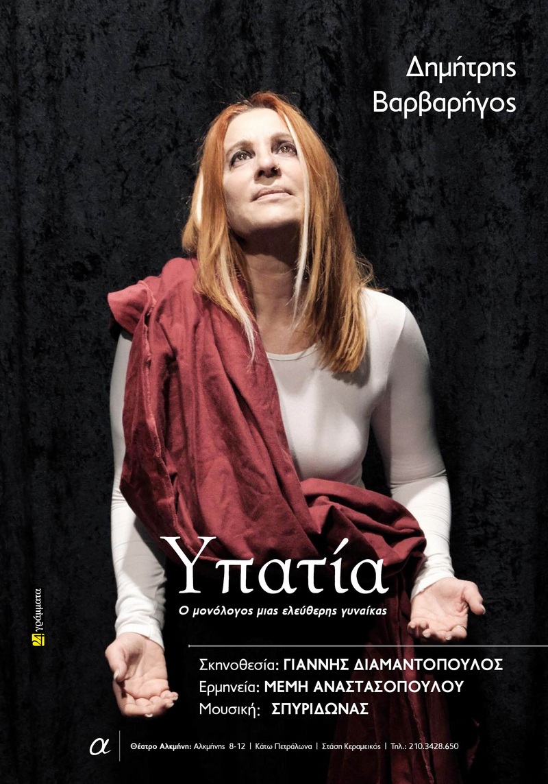 Η Υπατία, για πρώτη φορά, ανεβαίνει στο θέατρο σε έναν καθηλωτικό μονόλογο, σε μεταφορά από το ομώνυμο βιβλίο με την υπογραφή του συγγραφέα Δημήτρη Βαρβαρήγου, που με λόγο ευθύ απογυμνώνει σκληρές αλήθειες για την τυφλή δογματική πίστη, τον θεό, τη μητρότητα και την αγάπη ως μοναδικό αγαθό.