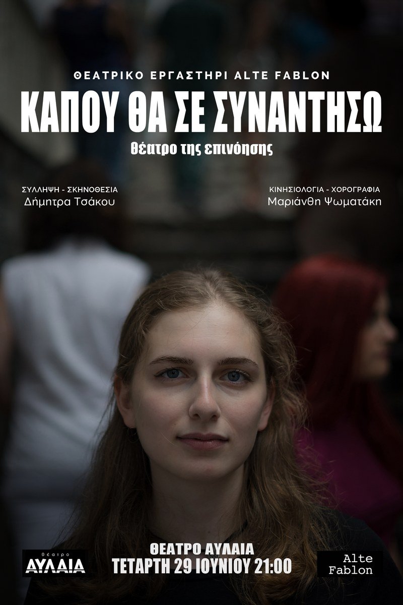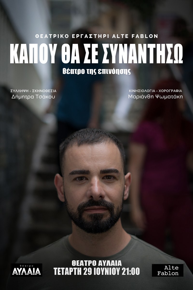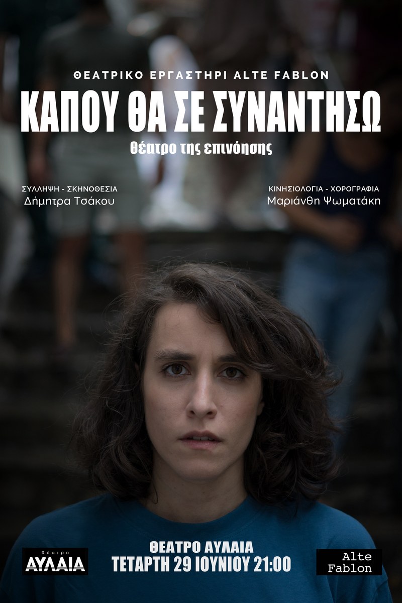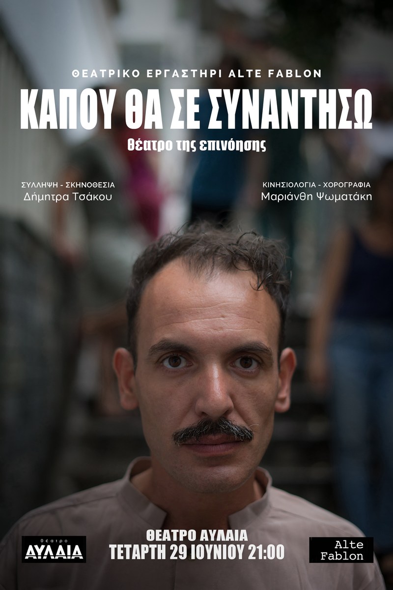 Η ζωή μας είναι γεμάτη συναντήσεις. Τυχαίες ή καρμικές, καθοριστικές ή ασήμαντες, ανεπανάληπτες ή καθημερινές, πολυπόθητες ή ανεπιθύμητες. Όπως κι αν εξελιχθούν όμως, το σημαντικό τελικά είναι να γίνει η συνάντηση, να συναντηθούμε, να συναντιόμαστε με ο,τι κι αν αυτό συνεπάγεται. Γι' αυτό σου λέω, δεν μπορεί..." Κάπου θα σε συναντήσω"! Μια παράσταση Θεάτρου της Επινόησης από το θεατρικό εργαστήρι Alte Fablon, μια παράσταση συλλογικής δημιουργίας, με πολύ αγάπη και όρεξη για τον αυτοσχεδιασμό, το θέατρο και φυσικά τις συναντήσεις!
