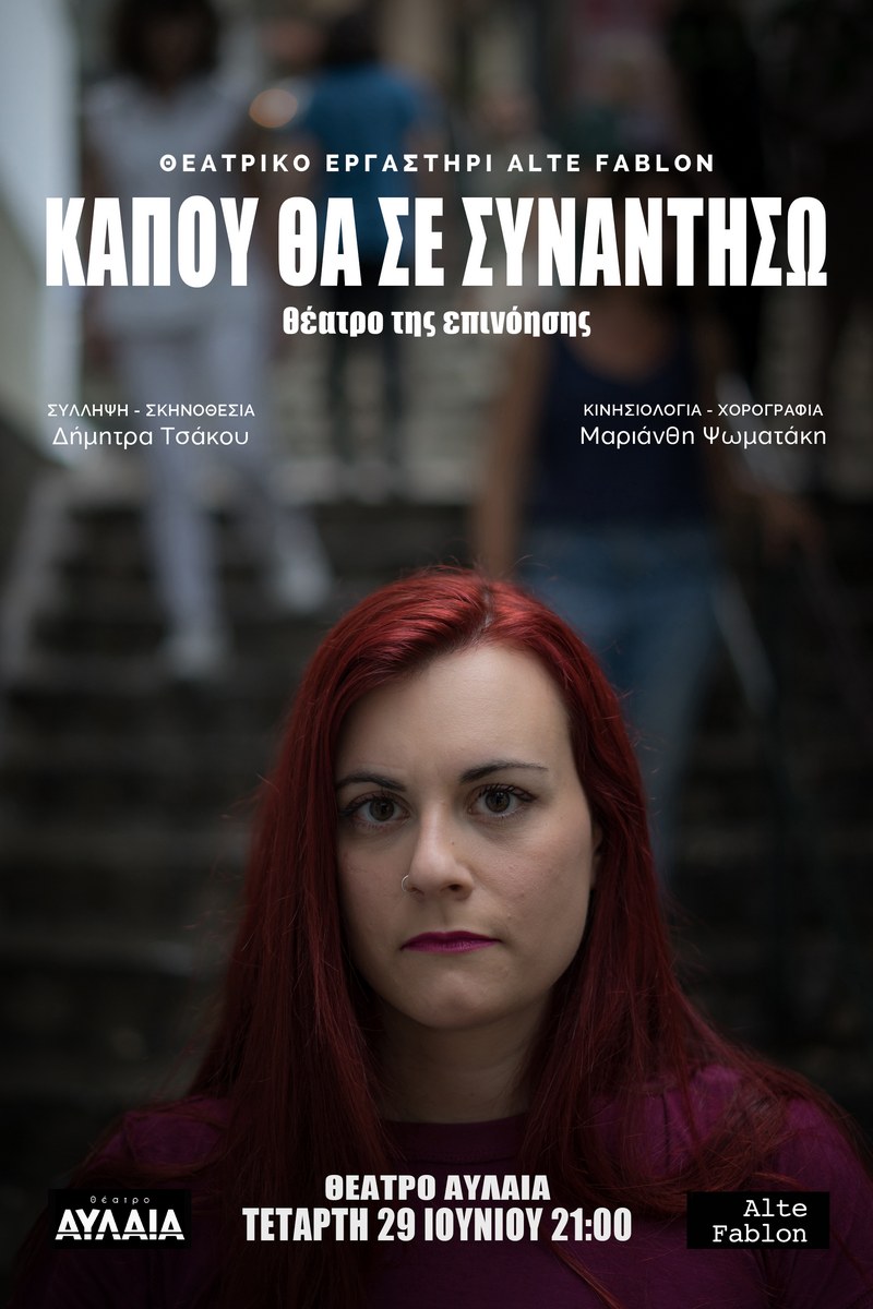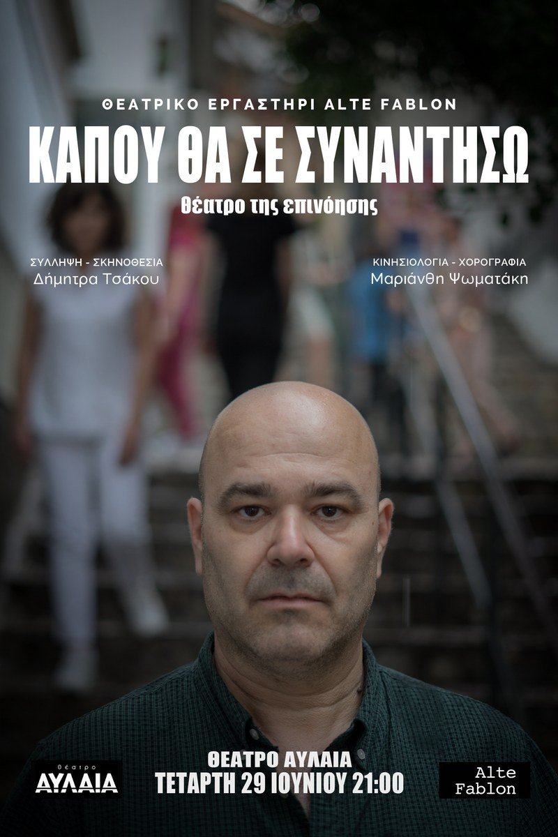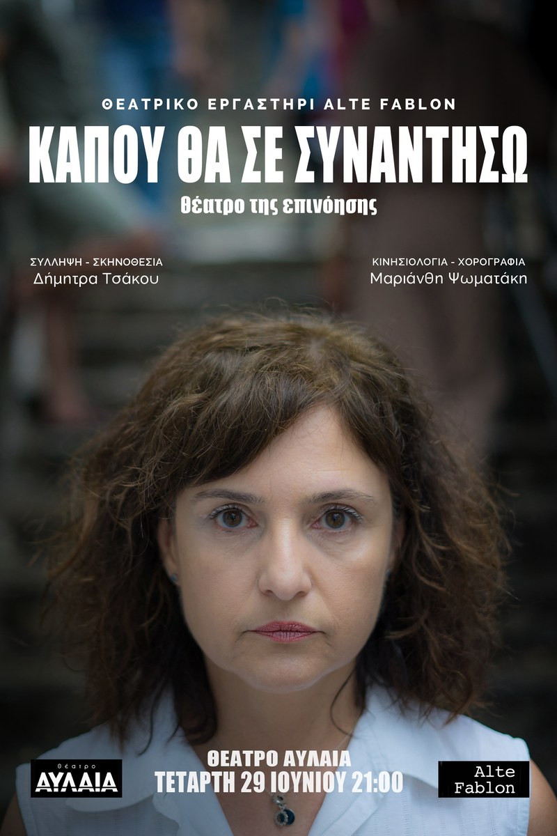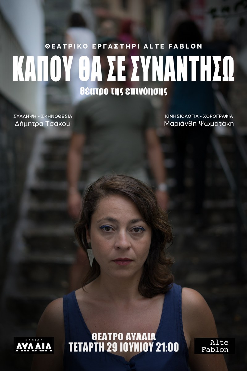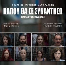 Η ζωή μας είναι γεμάτη συναντήσεις. Τυχαίες ή καρμικές, καθοριστικές ή ασήμαντες, ανεπανάληπτες ή καθημερινές, πολυπόθητες ή ανεπιθύμητες. Όπως κι αν εξελιχθούν όμως, το σημαντικό τελικά είναι να γίνει η συνάντηση, να συναντηθούμε, να συναντιόμαστε με ο,τι κι αν αυτό συνεπάγεται. Γι' αυτό σου λέω, δεν μπορεί..." Κάπου θα σε συναντήσω"! Μια παράσταση Θεάτρου της Επινόησης από το θεατρικό εργαστήρι Alte Fablon, μια παράσταση συλλογικής δημιουργίας, με πολύ αγάπη και όρεξη για τον αυτοσχεδιασμό, το θέατρο και φυσικά τις συναντήσεις!