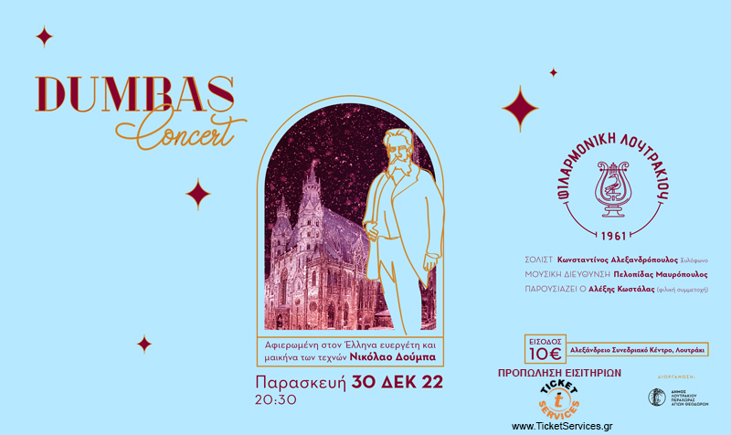 Η καθιερωμένη πρωτοχρονιάτικη συναυλία της Φιλαρμονικής Ορχήστρας Λουτρακίου φέρει φέτος τον τίτλο «Dumbas Concert» και είναι αφιερωμένη στον Νικόλαο Δούμπα, τον Έλληνα Μαικήνα των Τεχνών και μέγα ευεργέτη της Ελλάδας και της Αυστρίας.